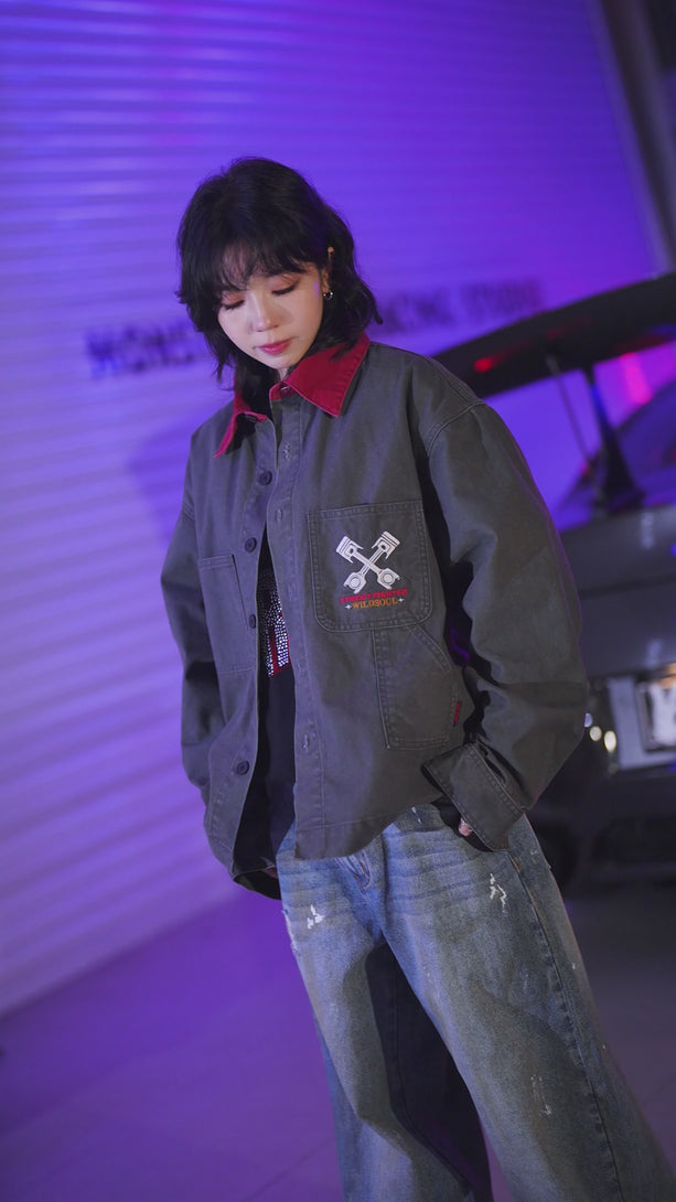 WILDSOUL STREET FIGHTER MIDNIGHT - Grey Washed Denim Jacket with Red “Street Fighter” & “街道” Back Print | Oversized Streetwear COAT